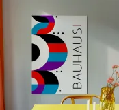 Un poster astratto straordinariamente moderno e vibrante, caratterizzato da grandi segmenti circolari e semicircolari concentrici e interconnessi. Il disegno utilizza un'audace tavolozza di ispirazione primaria, composta da rosso, blu ciano, viola e nero, su un nitido sfondo bianco. La composizione è dinamica, con blocchi di colore geometrici e linee pulite che incarnano i principi funzionalisti e modulari del movimento Bauhaus. Il bordo destro è ancorato dalla parola "BAUHAUS" visualizzata verticalmente in un carattere sans-serif nero minimalista, separato da una sottile linea rossa. Questo poster digitale di alta qualità (7000x50