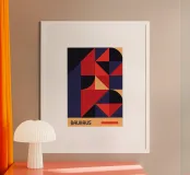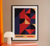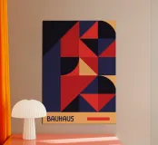 Uno straordinario poster astratto nella tradizione geometrica e audace del Bauhaus e di De Stijl. La composizione è un fitto intreccio di triangoli e quarti di cerchio che crea un senso di movimento e profondità. La ricca tavolozza di colori è caratterizzata da un profondo blu navy, un rosso intenso e un caldo pesca/ocra, che creano un equilibrio visivo dinamico. La parola "BAUHAUS" è visualizzata in modo chiaro su una fascia ocra nella parte inferiore. Questa arte digitale di alta qualità (7000x5000 pixel, 300 dpi) garantisce una nitidezza eccezionale e una riproduzione vibrante dei colori, rendendola un pezzo perfetto e di grande impatto per gli interni moderni.