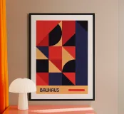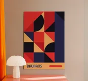 Un potente poster astratto Bauhaus dominato da un mosaico geometrico di quadrati, triangoli e quarti di cerchio in un'audace tavolozza di ispirazione primaria: rosso intenso, blu navy e caldo pesca/arancio. La composizione è caratterizzata da un blocco verticale marino sulla destra e da una banda orizzontale color pesca in basso, che crea una forte divisione. Questo disegno incarna perfettamente la bellezza strutturata e funzionale del Modernismo. Questo file poster digitale di qualità superiore (7000x5000 pixel, 300 dpi) garantisce dettagli ad alta risoluzione e colori ricchi e d'impatto per una stampa di qualità.