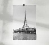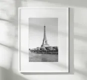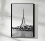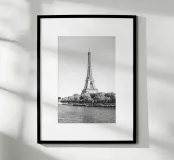 Fotografia in bianco e nero della Torre Eiffel e della Senna a Parigi, Francia.