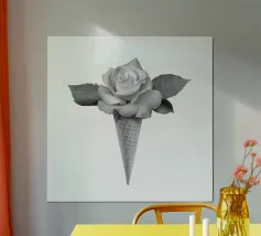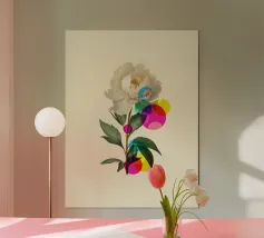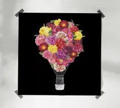 Stravagante arte del collage con un bouquet di rose, peonie e stelle glitterate dorate. Un tocco gioioso e surreale di design a tema floreale e alimentare.