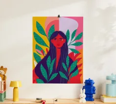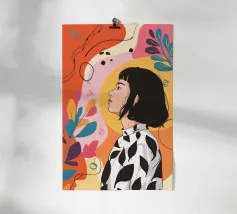 Un'illustrazione vivace e moderna di una donna con gli occhi chiusi, avvolta in un cappotto colorato ispirato alla natura. Le texture audaci e i motivi botanici simboleggiano la forza interiore, l'emancipazione e l'espressione di sé.