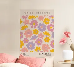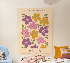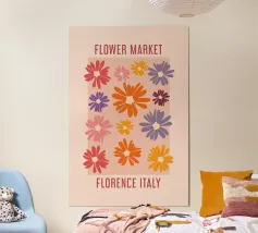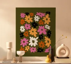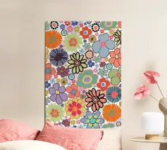 Un motivo floreale giocoso che sembra una passeggiata visiva in un festival di giardini retrò: I fiori stilizzati, nei colori arancione, rosa, viola, rosso e giallo, danzano liberamente. Ogni fiore ha una forma semplice, simile a una margherita, con lunghi petali a raggiera che emergono da un punto centrale. La disposizione è volutamente irregolare, come un disegno sparso di gioia, estate e nostalgia.