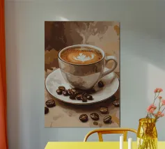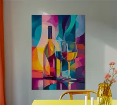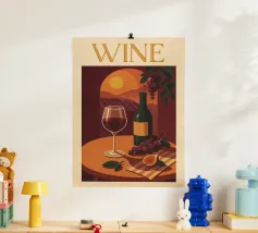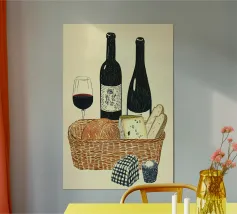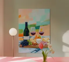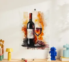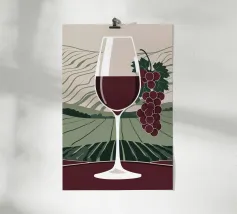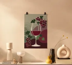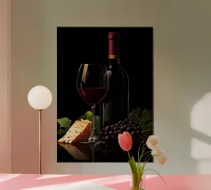 Due bottiglie di vino, un bicchiere di vino rosso e uva fresca su uno sfondo di foglie di vite verdi: questa classica natura morta è un omaggio al piacere, all'artigianato e alla natura. I colori tenui e la rappresentazione realistica rendono il motivo particolarmente adatto a cucine, sale da pranzo o cantine. Ideale per gli amanti del vino, i sommelier o come regalo per gli intenditori.