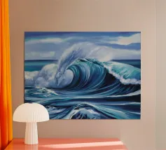 Quest'onda oceanica si alza e si arriccia con un movimento ampio e scultoreo. La pennellata strutturata conferisce alla superficie una qualità quasi pittorica, mentre i gradienti blu vividi si infrangono in una schiuma luminosa. Una stampa perfetta per case al mare, bagni o interni moderni che desiderano energia, movimento e calma da acqua salata.