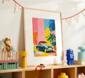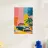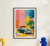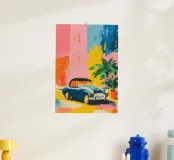 Pittura minimalista a guazzo con forme piatte e pennellate larghe: Una classica decappottabile blu si trova all'angolo di una strada davanti a edifici colorati. Pareti rosa pastello, accenti gialli e una palma in vaso conferiscono alla scena movimento, colore e carattere urbano.