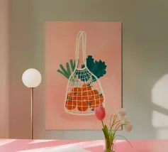 Una natura morta vivace e stravagante con succosi cachi annidati in un sacchetto di rete color menta, su strisce verdi di ispirazione vintage. Questo audace pezzo pop-art dà un tocco di freschezza alle pareti della cucina, agli angoli della galleria o al vostro angolino preferito. Un delizioso cenno alla vita lenta e al fascino retrò.