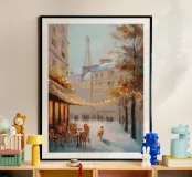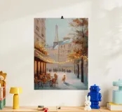 Caffè di Parigi nella neve invernale con cane e vista sulla Torre Eiffel carta hahnemühle