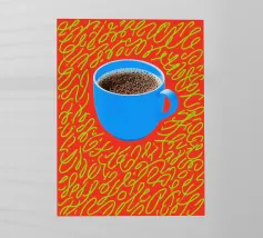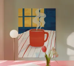 Una tazza blu brillante si staglia con forza contro il vibrante arancione, circondata da insegne al neon che sembrano un mantra indecifrabile sulla caffeina. Qui la pop art incontra l'energia della street art: aree chiare di colore, contrasti accesi, ritmo pulsante. Le scritte criptiche evocano la velocità, l'ondata di pensieri, il risveglio caotico dopo il primo sorso. Quest'opera non è una tranquilla natura morta, ma un forte espresso visivo: elettrizzante, urbano, zeitgeisty, risvegliante e trendy nel senso migliore del termine.