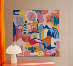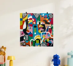 Colori audaci e contrastanti e forme astratte interconnesse caratterizzano quest'opera d'arte di grande impatto visivo. Occhi e forme organiche sono sottilmente inseriti all'interno del vibrante arazzo, suggerendo una narrazione giocosa e misteriosa attraverso il suo design geometrico ma fluido.