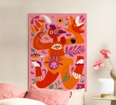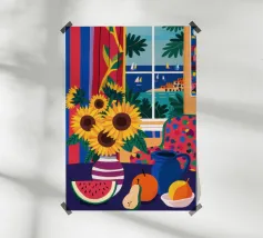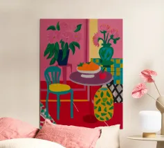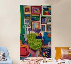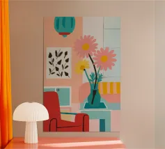 Scena di un interno accogliente e colorato di una stanza. La luce filtra da una finestra e illumina un tappeto a fantasia, un tavolo con un vaso di fiori arancioni e diversi quadri incorniciati che decorano le piacevoli pareti blu.