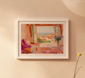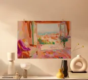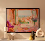 Un dipinto digitale ad alta risoluzione, vibrante e inondato di sole, che cattura una splendida vista interna di una città costiera. La scena è incorniciata da una finestra aperta, con spesse ed espressive pennellate di mandarino, pesca e corallo che dominano le pareti interne, il pavimento e i raggi del sole. All'esterno, la vista spazia sui tetti in terracotta fino al mare fresco e blu. Una chaise longue con un tessuto a contrasto magenta e viola si trova vicino a un tavolo con un vaso di lavanda, aggiungendo un potente tocco di colore massimalista allo spazio caldo. La trama spessa e visibile trasmette una sensazione di calore estivo ricco e lussuoso. Questo pr
