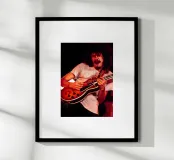 Un chitarrista dai capelli ricci che indossa una semplice maglietta, profondamente immerso nel suonare una chitarra elettrica sunburst.