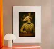 Entrate in un mondo in cui il film noir incontra il surrealismo. Casablanca Greyhound ritrae un levriero albino seduto di profilo, vestito in modo impeccabile con uno smoking color crema e un papillon nero. Una sigaretta indugia tra le sue dita, mentre un bicchiere di whisky è appoggiato con disinvoltura sul tavolo. La luce dorata filtra attraverso le ombre geometriche, immergendo la scena in una tranquilla raffinatezza.
