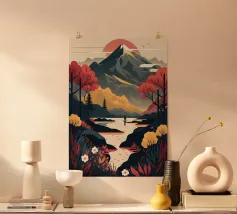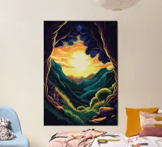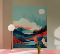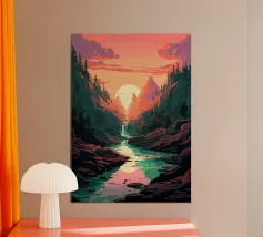 Si apre un paesaggio ipnotico, dove cime imponenti trafiggono un cielo pieno di sfere di luce. La scena è un tripudio di colori, con sfumature di arancio, rosa, blu e viola che si fondono senza soluzione di continuità. L'uso di linee spigolose e taglienti accostate a forme morbide e arrotondate crea una tensione visiva accattivante. Un fiume tranquillo si snoda nella valle, riflettendo i colori vibranti che la sovrastano. Quest'opera invita lo spettatore a esplorare un mondo in cui colore e forma danzano in perfetta armonia.