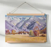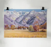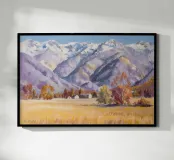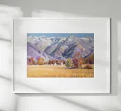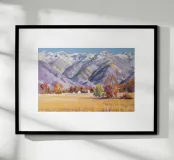 Maestose montagne innevate si ergono su una valle tranquilla e invernale; la luce nitida e la fresca tavolozza di bianchi, blu e gialli pallidi catturano la bellezza silenziosa e serena del paesaggio alpino.