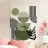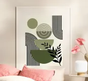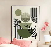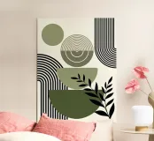 Le forme geometriche nei toni del verde terra sono completate da linee nere decise e da elementi astratti a forma di foglia. La composizione crea un'estetica equilibrata e moderna.
