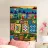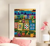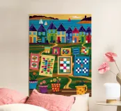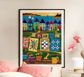 Illustrazione di una colorata città di mare, resa in uno stile che ricorda una trapunta patchwork. Le forme stravaganti e i colori vivaci creano un paesaggio affascinante, popolare e fantasioso.