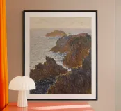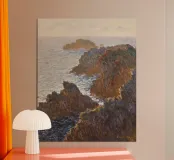 Le Rocce a Belle-Île, Port-Domois (1886) di Claude Monet cattura la drammaticità della costa bretone, dove le scogliere frastagliate incontrano il mare inquieto. Dipinta durante il suo soggiorno a Belle-Île, la tela riflette il fascino di Monet per la luce e l'atmosfera, mentre le onde si infrangono contro le scure formazioni rocciose in un cielo mutevole. Con pennellate audaci ed espressive, l'artista trasforma la cruda forza della natura in un vibrante paesaggio marino impressionista.