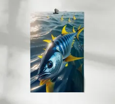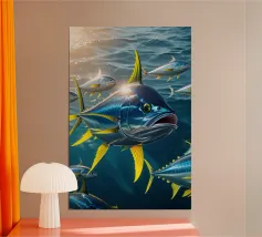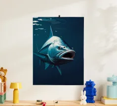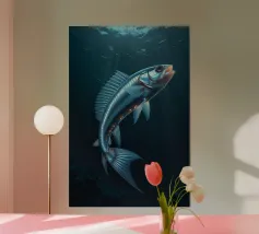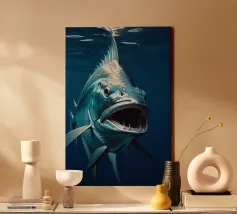 Questo dipinto offre una straordinaria visione ravvicinata di un barracuda, sottolineandone l'espressione feroce e i denti affilati come rasoi. Lo stile iperrealistico dà vita a ogni dettaglio, dal luccichio degli occhi alle creste delle squame. Il blu intenso dell'acqua circostante crea un contrasto drammatico, con sottili increspature e riflessi che esaltano il realismo. Quest'opera d'arte è un tributo al barracuda come potente ed enigmatico predatore degli oceani, che mostra la sua cruda bellezza e il suo dominio nella catena alimentare marina.