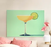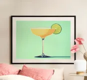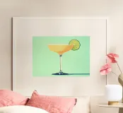 Un brindisi allo stile con questa stampa d'arte digitale Mid-Century Modern Cocktail. La composizione minimalista presenta un elegante bicchiere da cocktail riempito con una bevanda arancione, in netto contrasto con una guarnizione di lime verde brillante. Sullo sfondo di un vivace verde menta, le linee pulite e i colori decisi catturano l'estetica sofisticata e giocosa dell'epoca MCM e dello stile Pop Art. Questo pezzo è un'aggiunta perfetta e sorprendente al carrello del bar, alla cucina o alla parete della galleria. Questo poster di qualità superiore da 7000x5000 pixel e 300 dpi garantisce un'eccezionale fedeltà dei dettagli e dei colori, offrendo un'immagine fresca e di alta qualità.
