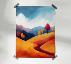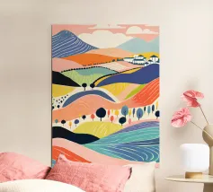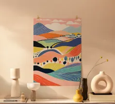 Morbide colline ondulate mostrano ricche sfumature di rosa, arancione e blu, mentre un cielo vibrante pieno di soffici nuvole esalta l'atmosfera tranquilla. Piccoli alberi punteggiano il paesaggio.
