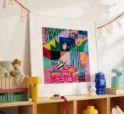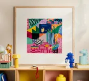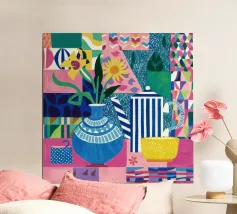 Un collage vibrante e caotico di motivi contrastanti, tra cui righe, pois e forme organiche. La gioiosa esplosione di colori e texture crea un'opera d'arte energica e piena di vita.