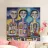Questa opera d'arte presenta due figure che assomigliano a robot, con forme e motivi geometrici sui loro corpi. Lo sfondo è un mix di blu e giallo, con elementi astratti.