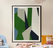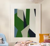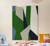 Un'immagine astratta con forme geometriche interconnesse in colori tenui come il verde, il grigio e il blu. La composizione crea un senso di movimento e complessità.