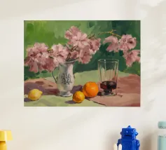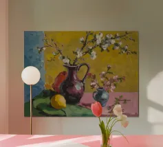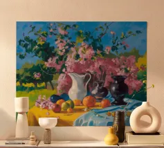 Un'audace natura morta con vivaci fiori rosso-rosa, forse papaveri o gerani, in un semplice vaso, accanto a fresche pere verdi, il tutto su una ricca tovaglia rossa che contrasta nettamente con uno sfondo blu intenso.