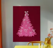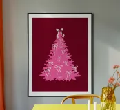 Un'affascinante illustrazione di un albero di Natale rosa ornato da graziosi fiocchi, perfetto per gli amanti delle civette e per gli appassionati di decorazioni vintage.