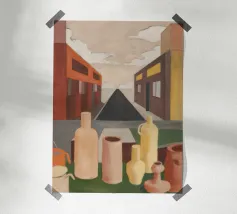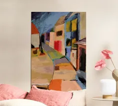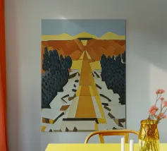 Un sentiero giallo brillante si snoda elegantemente attraverso un paesaggio minimalista di edifici grigi e squadrati. Il dipinto è uno studio sul contrasto dei colori e sulle forme geometriche pulite, che creano una scena urbana serena ma di grande impatto visivo.