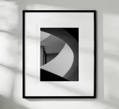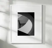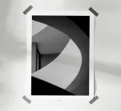 Poster in bianco e nero di architettura minimalista: curve organiche e spigoli vivi fotografati sotto una scala a chiocciola, vicino a una finestra. Il contrasto tra aree chiare e ombre profonde scolpisce una composizione fluida, geometrica e senza tempo, con delicate texture di stucco. Un elegante poster da parete che porta movimento, calma e modernità in salotto, camera da letto o ufficio, in stile contemporaneo, scandinavo, japandi o wabi-sabi.