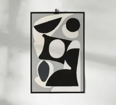 Una composizione astratta caratterizzata dalla sovrapposizione di curve e linee nere su uno sfondo beige. Il disegno gioca con i contrasti e le forme geometriche per creare un equilibrio tra movimento e immobilità.