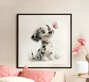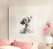 Un simpatico cucciolo di dalmata gioca felice in un prato fiorito, circondato da una farfalla e da fiori in un'incantevole illustrazione ad acquerello.
