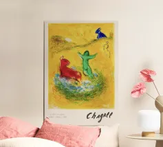 Questa litografia di Marc Chagall illustra una scena biblica, probabilmente raffigurante il re Davide che fugge da una finestra mentre la moglie Michal fa la guardia. Eseguita nella caratteristica tavolozza blu, grigia e bianca di Chagall, cattura un momento di dramma, lealtà e passione. Le figure sognanti e fluttuanti e la semplice ambientazione architettonica trasmettono una narrazione emotiva e senza tempo.