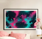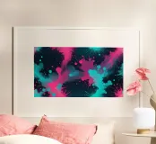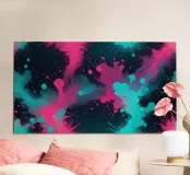 Spruzzi colorati di rosa e blu creano un energico disegno astratto su uno sfondo scuro, perfetto da usare come sfondo del desktop o decorazione artistica.