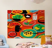 Una vibrante vista dall'alto di un banchetto di cibo festivo, con un gatto in mezzo a vari piatti come anguria, tacos e insalate. La scena è caotica, colorata e gioiosa.