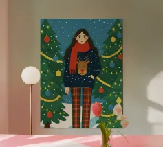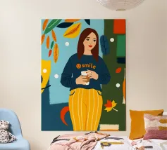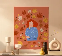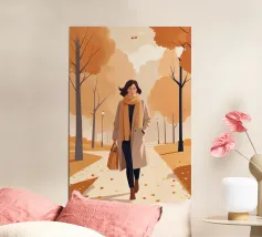 Una scena autunnale con una giovane donna che cammina lungo un sentiero che attraversa una colorata foresta autunnale. Lo sfondo è di un vivace azzurro cielo, che crea un contrasto deciso con le tonalità calde delle foglie e del fogliame autunnale. La donna indossa uno spesso maglione marrone, una sciarpa giallo senape avvolta attorno al collo e pantaloni a righe verticali arancioni, gialle e bianche che riprendono le tonalità autunnali circostanti.