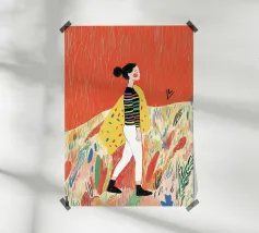 Donna che cammina in una foresta d'autunno carta hahnemühle