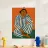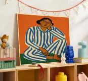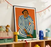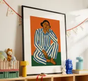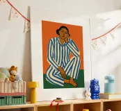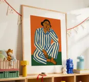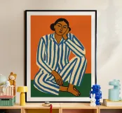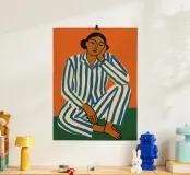 Una donna siede pensierosa in una posa rilassata, indossando un pigiama a righe bianche e blu. La donna è collocata su uno sfondo arancione caldo, che crea un forte contrasto cromatico.