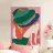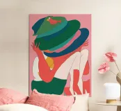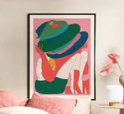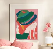 Un ritratto astratto di una donna il cui volto è oscurato da un grande cappello verde e da abiti colorati, che creano un'aura di mistero e intrigo elegante.