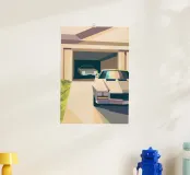 Illustrazione di due auto in un garage con uno stile geometrico moderno.