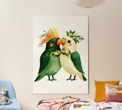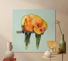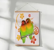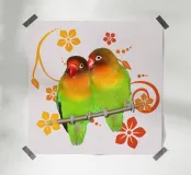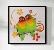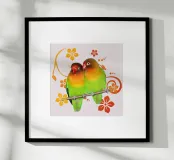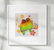 Un'immagine di due inseparabili della pesca appollaiati l'uno accanto all'altro. Elementi floreali aggiunti digitalmente. Sembrano molto rilassati e guardano l'osservatore.