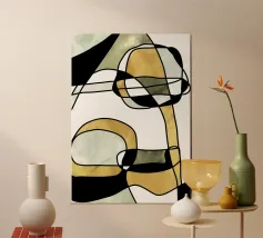 Forme astratte in nero, bianco e oro creano una composizione dinamica con curve fluide e angoli acuti. Il gioco di colori aggiunge profondità e movimento, suggerendo un senso di energia e contrasto.