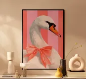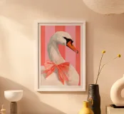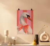 Testa di cigno dipinta a mano a guazzo con un vivace fiocco corallo su sfondo a righe arrossate. Luminosa tavolozza di colori pastello con tratti nitidi e un morbido tocco rétro. Perfetto per la cameretta o per un arredamento preppy.