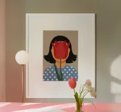 Un ritratto surreale e intrigante in cui il volto di una donna è oscurato da un grande tulipano rosso. Il suo top a pois e lo sfondo semplice creano un'immagine misteriosa e artistica che gioca con l'identità e la natura.