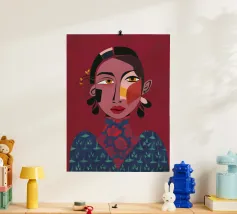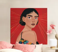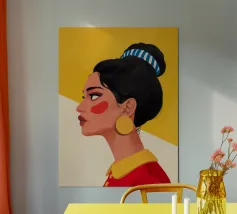 Questo dipinto raffigura una persona con i capelli scuri acconciati in due chignon, che indossa grandi orecchini arancioni. Il volto della persona è dipinto con audaci motivi rossi e bianchi, mentre lo sfondo è di colore rosso pieno.