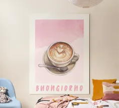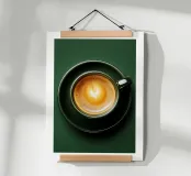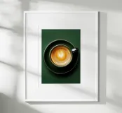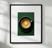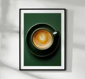 Vista dall'alto di un espresso cremoso in una tazza e un piattino verde intenso, con un cuore di latte art che galleggia sulla ricca crema. Lo sfondo tono su tono e la composizione minimalista mettono in risalto la ceramica lucida e le calde tonalità del caffè, creando un accento di design pulito per una cucina, un angolo caffè, un bar o un ufficio. Moderna, elegante e rassicurante, questa decorazione murale aggiunge calore, raffinatezza e attenzione a qualsiasi spazio.