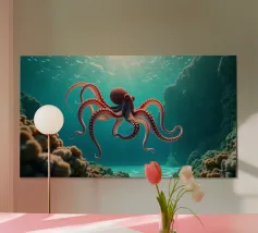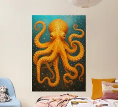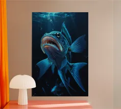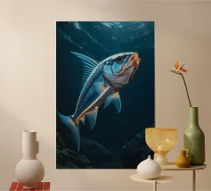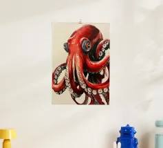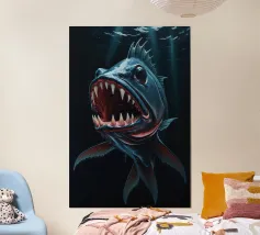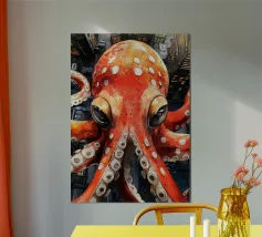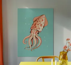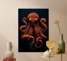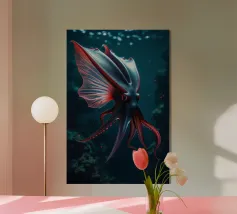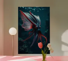 Questo dipinto iperrealistico cattura l'inquietante bellezza del calamaro vampiro, un'enigmatica creatura delle profondità marine nota per il suo aspetto sorprendente. Il suo corpo nero vellutato contrasta con il rosso fuoco delle sue delicate braccia palmate, conferendogli una presenza quasi soprannaturale. Gli occhi bioluminescenti del calamaro brillano di un'intensa tonalità cremisi, riflettendo la scarsa luce che penetra negli abissi. Sospeso nelle acque scure, minuscole particelle incandescenti lo circondano, sottolineando la sua natura ultraterrena. Quest'opera d'arte ritrae magistralmente il movimento ammaliante e aggraziato del calamaro vampiro.